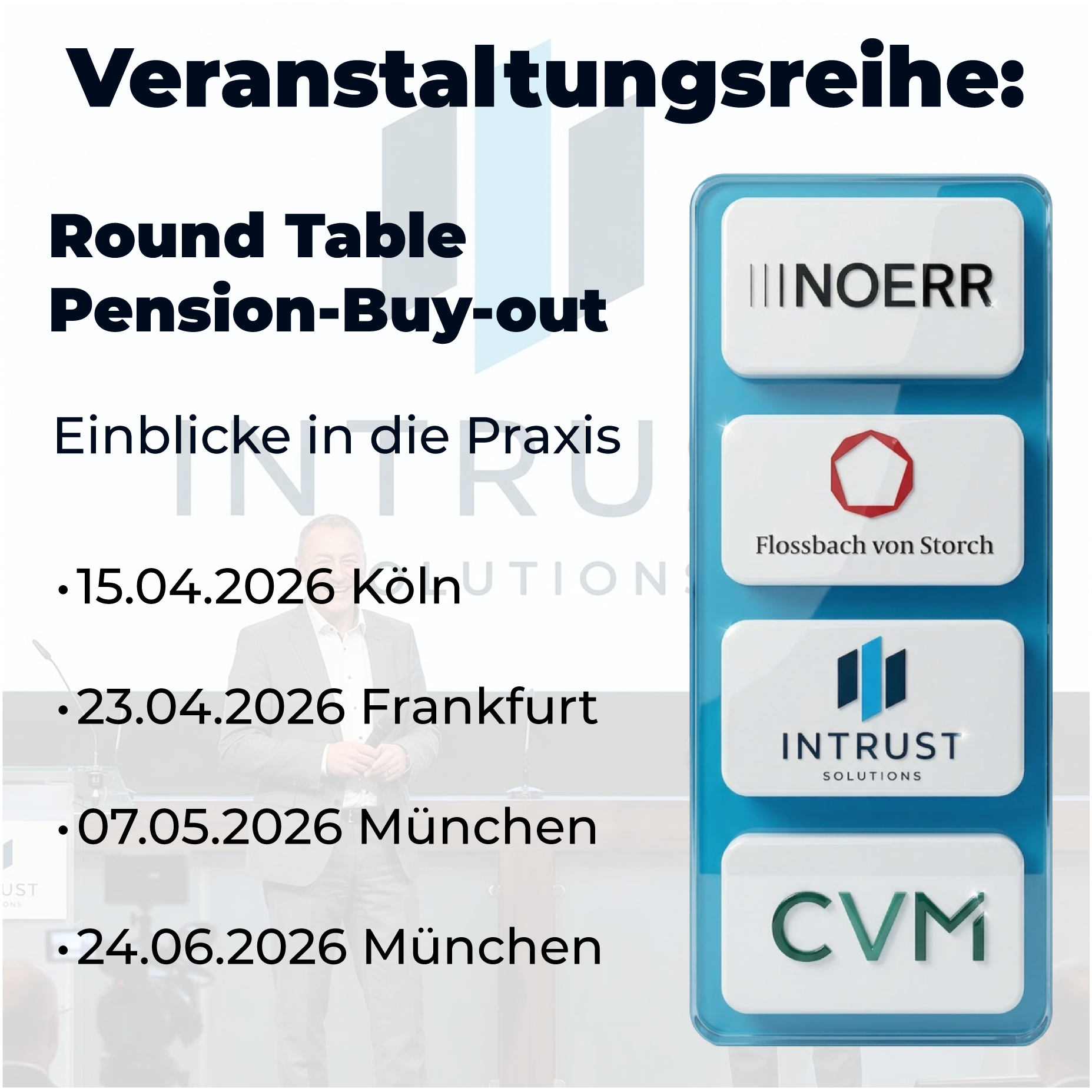 Gemeinsam zeigen die Expertinnen und Experten des Corporate-Finance-Beratungshauses CVM, dem Vermögensverwalter Flossbach von Storch, der spezialisierten Rechtsanwaltskanzlei Noerr und dem Pension Buy-Out Anbieter Intrust Solutions anhand konkreter Fallbeispiele praxistaugliche Wege im Umgang mit Pensionsverpflichtungen auf und geben exklusive Einblicke in die praktische Umsetzung eines Pension Buy-outs. Im Anschluss an die Fachvorträge besteht bei einem kleinen Imbiss die Gelegenheit zum persönlichen Austausch mit den Referenten sowie zur Vernetzung mit den weiteren Teilnehmenden.Freuen Sie sich auf fundierte Einblicke, praxisnahe Diskussionen und den Austausch mit Teilnehmenden aus unterschiedlichsten Branchen.